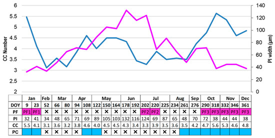 The graph shows the number of cambial cells (CC, blue line) and phloem increments distance (PI, violet line) between CC and the nearest phloem fibres cluster (PF) in Q. ilex. The scheme below the X-axis indicates the occurrence timing of new formed PF groups (PF1, PF2, PF3 in violet square) and PC (cells with primary wall in blue square) in different periods of the year. X× = no PF or PC (post-cambial) cells detected. DOY, day of the year from January to December 2017.