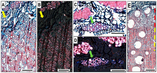 Q. ilex cross-sections with (A) development of PC cells stained with astra blue in October; (B) the same section region as in (A) but observed in polarised light; (C) formation of developing phloem fibres PF stained with safranin and astra blue in November; (D) the same wood region as in (C) but under polarised light. (E) Total wood increment (yellow dashes) with IADF (red dashes) formed during the year 2017. Scale bars = 100 µm.