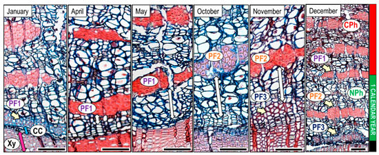Wood, cambium, and phloem with fibre groups (PF) in January, April, May, October, November, and December in tree number 7. PF1, PF2, and PF3 serve as an orientation to evaluate the amount of phloem formed from January by the sampling date (white arrows with double heads). The sample taken in December (right image) contains non-collapsed phloem (NPh) with three groups of fibres which corresponds with the amount of phloem formed in one calendar year, 2017; the phloem formed in the previous year is already collapsed (CPh). Scale bar = 100 µm.