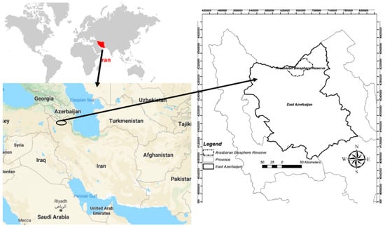 The research was done in the Arasbaran biosphere reserve in Northwest Iran at the border of Armenia and Azerbaijan between 38°35′ N–39°00′ N latitude and 45°45′ E–47°05′ E longitude (Figure 1). Forest types are natural, mixed hardwood and broad-leaved deciduous forests with an area about 153,000 ha. The climate is semi-humid with an average annual temperature of 14 °C and an average rainfall of 400 mm per year. The main species in these forests are oak (Quercus macranthera Fisch. & C.A.Mey. ex Hohen.), hornbeam (Carpinus betulus L.), maple (Acer campestre L.), yew (Taxus baccata L.), wayfaring tree (Viburnum lantana L.), reddish-black berry (Ribes petraeum Wulfen), and walnut (Juglans regia L.). The occupations of the local people in the target watershed are primarily based on combinations of animal husbandry, farming, carpet-weaving, beekeeping, and cultivation or extraction of forest products [18,19].