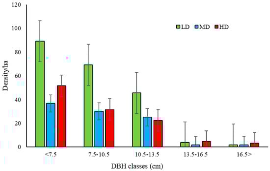 Tree (DBH ≥ 5 cm and height ≥ 1.5 m) density by diameter at breast height (DBH) class and destruction class in a naturally-regenerated broadleaf forest in the Arasbaran biosphere reserve in Iran (n = 30). LD = Low Destruction, MD = Medium Destruction, and HD = High Destruction. See Table 2 for a description of the destruction class.