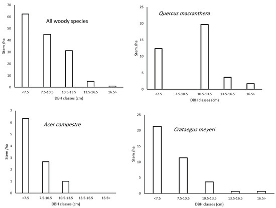 The DBH class distribution of woody species in all destruction classes reflected a somewhat reversed J-shape (L-shape) (Figure 2 and Figure 3). This includes where species frequency distribution had the highest frequency in the lower diameter classes and a relatively gradual decrease toward the higher classes (Figure 2). Individual trees having DBH < 7.5 cm accounted for 76% and 73% of all trees recorded at the LD and HD sites, respectively (Figure 3). The range of DBH was between 5.3 to 21 cm. At the species level, C. meyeri tree density reflected a similar distribution to the stand scale (Figure 3). Diameter distributions of Q. macranthera trees were irregular. For the A. campestre, a high percentage of trees were <7.5 cm and none were found in the two large DBH classes (13.5–16.5 cm and >16.5 cm).