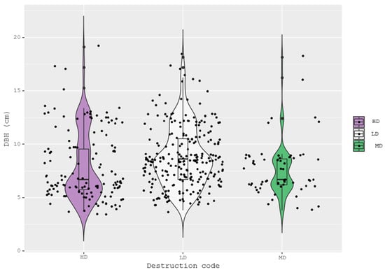 Violin plot (box plot plus kernel density envelop) of tree size (DBH) and disturbance index (by destruction class) distribution in a naturally-regenerated broadleaf forest in the Arasbaran biosphere reserve in Iran (n = 30). LD = Low Destruction, MD = Medium Destruction, and HD = High Destruction. See Table 2 for description of the destruction class.