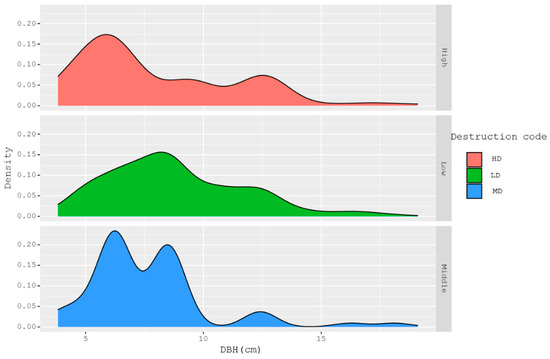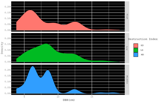 Density frequency distribution of tree size (DBH) by the destruction class in a naturally-regenerated broadleaf forest in the Arasbaran biosphere reserve in Iran (n = 30). LD = Low Destruction, MD = Medium Destruction, and HD = High Destruction. See Table 2 for description of the destruction class.