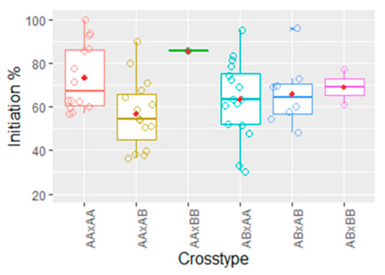 Mean SE-initiation % of different parent PaLAR3 genotypes from 2011 to 2015. Each circle denotes initiation % of one full-sib SE-family.