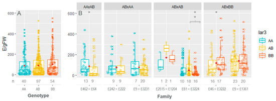 Embryo production capacity (embryos per gram fresh weight; E/gFW) of different PaLAR3 genotypes (A) of seven Norway spruce full-sib SE-families (B), with the number of SE lines given for each allelic combination (n). Asterisks denote differences between genotypes within each family (* p < 0.05, ** p < 0.01).