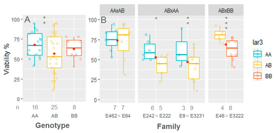 Embling viability (%) of different PaLAR3 genotypes (A) of four Norway spruce full-sib SE-families (B) in the end of first growing season with the number of SE lines given for each allelic combination (n). Asterisks denote differences between genotypes (* p < 0.05, ** p < 0.01, *** p < 0.001).