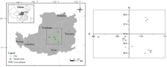 The study sites were in the north-central provinces of China, in the central hilly region of the Loess Plateau (Figure 1). The climate is semi-arid with an average rainfall of 437 mm, with >77% falling from June to September. The mean annual temperature is 8.8 °C, ranging from −9.7 °C in January to 23.7 °C in July. The soil is a Huangmian soil []. The study area is a warm forest steppe where natural forests have been destroyed because of water and soil erosion, but where Robinia pseudoacacia, Armeniaca sibirica, Hippophae rhamnoides, Caragana korshinskii, and Medicago sativa have been abundantly planted for soil and water conservation. The native grasses are mainly composed of Poa sphondylodes, Lespedeza davurica, and Stipa bungeana.