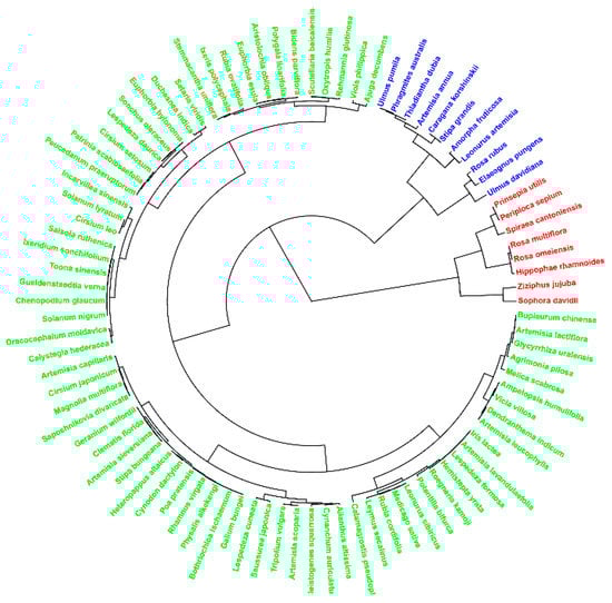 A system clustering was proposed for stand segmentation on the basis of the average height of each species at the 33 sites (Figure 2). All undergrowth was divided into three layers: (I) a mainly low herbaceous layer (<80 cm), (II) a mainly high herbaceous layer (80–130 cm), and (III) a mainly shrub layer (>130 cm). Species with an average height >130 cm, such as H. rhamnoides, Sophora davidii, Ziziphus jujuba, and Periploca spium, were classed into layer III. Herbaceous layers were divided into two sublayers. Layer I mainly contained Viola philippica, Ajuga decumbens, Bidens parviflora, Dracocephalum moldavica, Sonchus oleraceus, Artemisia lavandulaefolia, Potentilla bifurca, Leymus secalinus, Melica scabrosa, and Hemistepta lyrate, among others. Layer II mainly contained herbaceous and tree seedings, such as Stipa grandis, Phragmites australis, Amorpha fruticose, and Ulmus daviana.