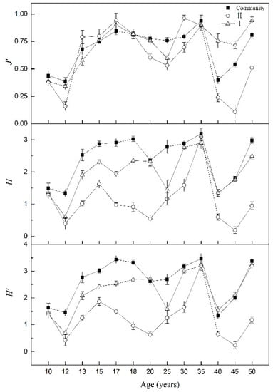 We describe understory vegetation stand compotation using species diversity measured across a vertical profile. There were few or no species in layer III at the sample plot, and thus we did not count their diversity. We calculated the species diversity for the overall community, layer II, and layer I. The statistical parameters of the three diversity indices (H′, H, and J) are shown in Figure 4. H, H′, and J′ had similar trends in the different layers. All indices initially increased and then decreased from 10 to 25 years, and all indices increased from 25 to 35 years. All indices first decreased and then increased for the forests older than 35 years. J′ for the layers varied little between 10 and 35 years, but followed the order I > Community > II. H and H′ varied little between 10 and 50 years, but H varied more subtly than H′. H and H′ had the same trends for the shrub layer and the community as a whole, and layer I was the most stable. H and H′ followed the order Community > I > II for plantation 10–35 years. The diversity indices were higher for layer I than Community. H, H′, and J′ for the various layers peaked at 17 and 35 years.