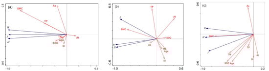 Redundancy analysis of species diversity of (a) overall community, (b) layer II, and (c) layer I with environmental factors. SOC, soil organic carbon; TN, total N; TP, total P; SMC, soil moisture content; Sl, slope; As, aspect; At, altitude.