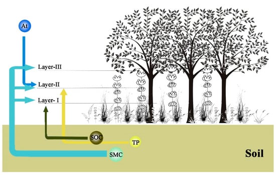 Understory composition and stratification of artificial forests have specific characteristics. Understory composition and stand of black locust plantation in Loess Plateau are mainly limited by soil moisture. SMC, At, SOC, and TN content affected species diversity and drove forest structure (Figure 6). Soil moisture content, an important soil factor, restricted the restoration of the local vegetation. We can intervene in the formation of community structure by controlling environmental factors, and thus communities can efficiently use the environmental resources and quickly form climax communities. For instance, we can control layer I composition by adjusting SMC, SOC, and TN. Comprehensive understanding of understory stand composition and interactions with the microenvironment is necessary to maintain and predict a plantation’s ecology function. We can effectively manage artificial forests by intervening in specific forests, providing a new strategy for the conservation of artificial forests. Further research should focus on the specific roles of environmental factors in forest stand composition.