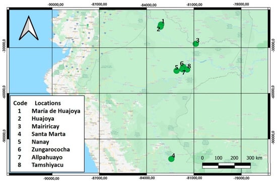 During this study, a total of 90 Peruvian rosewood accessions collected from eight localities were used as plant material (Table 1, Figure 1). These eight localities are present in the regions of Loreto and Ucayali, in the Peruvian Amazon which is considered the main habitats of rosewood in Peru. Among these eight, three localities are in the vicinity of Iquitos city, two of them accessible by road, and one on the margin of the Amazonas River. One population collected from Allpahuayo is close to the Allpahuayo− Mishana National Reserve. Populations from localities Zungarococha, Mayriricay, Nanay, Tamshiyacu and Santa Marta are located within private estates, while populations collected from Huajoya and Maria de Huajoya, are present within native community lands. The Zungarococha, Allpahuayo and Mairirircay plantations resulted from botanical seeds of natural trees identified from the Tamshiyacu area. The purpose of zungarococha plantation was teaching, since it is a part of the Agronomy Faculty of the National University of the Peruvian Amazon. With regard to the Allpahuayo plantation, its purpose was to evaluate the development of this species in sandy soils and subsequently, essential oil analyses are performed. This plantation is conserved by the Peruvian Amazon Research Institute. Finally, the Mairiricay plantation was carried out by PEDICP (Binational Special Project for the Integral Development of the Putumayo River Basin) as part of an implementation project. To conserve rosewood populations, a pilot plantation project was started 25 years ago in the perimeter zone of the Allpahuayo National, Reserve by The Instituto de Investigaciones de la Amazonía Peruana (IIAP). Zungarococha, Allpahuayo and Mairirircay populations are plantations from material originating from Tamshiyacu. These rosewood plantations are now 25, 20 and 15 years old, respectively.