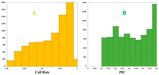 Frequency histogram revealing call rate and polymorphism information content (PIC) values of the applied DArTseq markers. (A): call rate of 7485 DArTseq markers; (B): PIC value of 7485 DArTseq markers