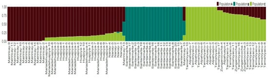 - Pritchard, J.K.; Stephens, M.; Donnelly, P. Inference of population structure using multilocus genotype data. Genetics 2000, 155, 945–959. [Google Scholar]