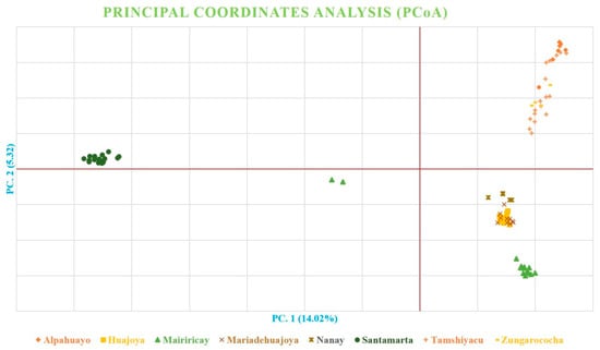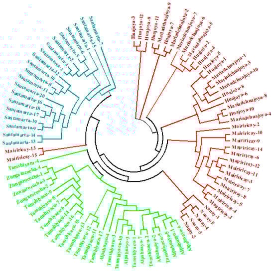 STRUCTURE, neighbor-joining analysis, and PCoA were used as clustering algorithms to elucidate the population structure of Peruvian rosewood germplasm. STRUCTURE algorithms were given more preference among these clustering algorithms as they showed more robustness in previous research works [52,53]. STRUCTURE software separated the whole germplasm into three main subpopulations (A, B, C) on the basis of their geographical localities (Figure 3). Accessions belonging to Mairiricay, Mariacdehuajoya, Huajoya, and Nanay localities were clustered together by making subpopulation A. It is clearly understandable from Figure 1 that Mariacdehuajoya, Huajoya, and Mairiricay are close to each other. Therefore, these populations clustered within the same subpopulation of structure analysis. There was a possibility of frequent gene flow among these populations which resulted in genetic similarity and their grouping under the same population. To support this hypothesis, various diversity indices were calculated among STRUCTURE-based subpopulation (Table 4). Results confirmed the existence of higher genetic diversity, genetic distance and gene flow in subpopulation A. A total of five accessions from the Nanay location were used as plant material. However, only two accessions (Nanay-4, Nanay-5) showed a membership coefficient of more than 75% and grouped in subpopulations A. Nanay population is located away from Mariacdehuajoya and Huajoya populations. However, the Nanay population clustered with these populations in STRUCTURE-based clustering. Mariacdehuajoya and Huajoya populations belong to the Napo basin which is next to the Nanay basin which contains the Nanay population. There is a great possibility of gene flow between Napo basin and Nanay basin that allows the clustering of Nanay population with Mariacdehuajoya and Huajoya population in structure analysis. Subpopulation B was found to be homogeneous as it clustered all accessions (a total of 20 accessions) belonging to the Santamarta location. The Santamarta population showed low gene flow and a higher coefficient of differentiation (Fst) than the rest of the populations (Table 4), which is possibly due to the greater geographical distance and isolation of this stand from the other localities. Santos et al. [47] observed the presence of higher gene flow among Brazilian rosewood populations close to each other and concluded that gene flow will decrease with the increase in geographic distance. Subpopulation C clustered a total of 22 rosewood accessions from Tamshiyacu, Alpahuayo, and Zungarococha localities. Clustering of Zunagarococha, Allpahuayo, and Tamshiyacu was expected because Zunagarococha and Allpahuayo were planted from material originating from the wild population of Tamshiyacu. It was interesting that a total of 11 rosewood accessions (three from Nanay and eight from Tamshiyacu populations) did not show genetic similarity with the above three populations. All of these accessions were considered unclassified accessions as they revealed membership coefficients Q < 75%. Grouping of rosewood accession in this study was also supported by our very recent study in which Peruvian rosewood germplasm was characterized with an ISSR marker [29]. The neighbor-joining analysis also supported the clustering of STRUCTURE software and grouped the whole germplasm into three populations on the basis of their collection points (Figure 5). Similar to STRUCTURE clustering, accessions from the Santamarta population were grouped together and confirmed their genetic dissimilarity to the rest of the populations. In a similar way to STRUCTURE clustering, populations from Mariacdehuajoya, Huajoya and Nanay localities were present very close to each other in PCoA-based clustering (Figure 5). Similarly, accessions from the Santamarta population were clustered together and made their separate population as observed in STRUCTURE and neighbor-joining analysis.