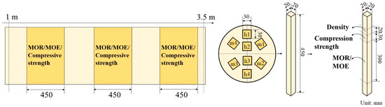 As shown in Figure 1, wood segments of each tree between 1 and 3.5 m in height were taken as research objects. Three 450 mm-long wood segments were cut and blank strips with an end-face size of 30 mm × 30 mm were prepared from them, wherein h1 and h4 samplings were close to the bark; h2 and h3 were nearby the pith; and m1, m2, m3, and m4 were taken from the middle of the discs. Then, wood strips with an end-face size of 20 mm × 20 mm were obtained by planing all around. In total, 71 (clone 50), 99 (clone 108), and 82 (clone N179) samples measuring 20 mm × 20 mm × 20 mm for density testing; 77 (clone 50), 102 (clone 108), and 93 (clone N179) samples measuring 300 mm × 20 mm × 20 mm (L × R × T) for MOR/MOE testing; and 77 (clone 50), 107 (clone 108), and 85 (clone N179) samples measuring 30 mm × 20 mm × 20 mm (L × R × T) for compressive strength parallel to grains testing were prepared, respectively. A sample of each was taken from a blank strip, realizing the integration of the sampling position.