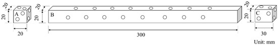 Diagram of the spectral collection position of the mechanical property samples. A: Density sample; B: bending sample; C: compressive strength parallel to grains sample.