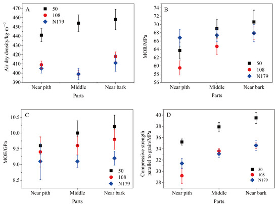 Material variation is one of the major characteristics of wood. The study of the radial variation of the physical and mechanical properties of wood is beneficial to the scientific processing and rational utilization of wood. Figure 3A shows the radial variation trend of the air dry density of three poplar clones from near the pith to near the bark. It can be seen that the air dry density values near the pith, middle, and near the bark of clone 50 were all higher than those of the other two clones. In the radial direction, the air dry density of clone 50 showed a gradually increasing trend from near the pith to near the bark, while clone 108 and N179 showed a trend that declined slightly from near the pith to the middle and increased slightly from the middle to near the bark, suggesting that there was no difference in the air dry density of clones 108 and N179 between heartwood and sapwood. The different clones should have different microstructures. Microstructures, such as the cell wall thickness and wall–lumen ratio, are the main impact factors of the density of wood [35]. The different radial variation trends of the air dry density of the three poplar clones may be due to their microstructures. The air dry density of clone 50 was higher than that of 108 and N179 for all three parts, so it might be that clone 50 had a thicker cell wall and higher wall–lumen ratio. This needs to be studied further.