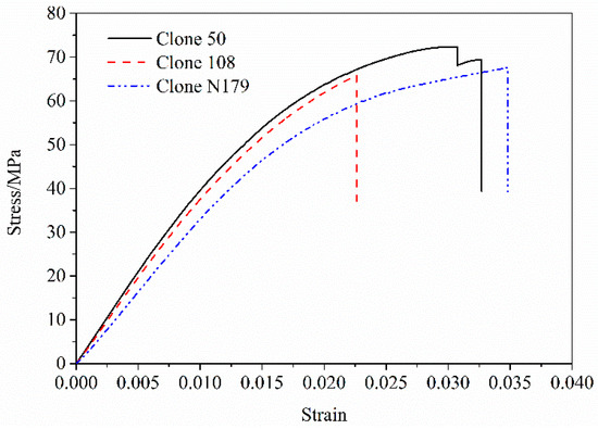 MOR is one of the most important indices of the mechanical properties that should initially be considered for making bending construction members. According to Table 3, the MOR of the three poplar clones ranged from 65.8 to 68.0 MPa. In the three poplar clones, the MOR of clone 50 was the highest, while that of clone 108 was the lowest. However, the results of multiple comparisons showed that there was no obvious difference among the three clones at the level of 0.05. Figure 4 shows the stress–strain curves of MOR of the three poplar clones. It can be seen that the trend of the curves was the same. With the increase of strain, the stress showed two stages of linear increase and slow growth until the specimen was broken.
