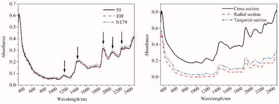 Figure 5 shows the original NIR spectra of three poplar clones and the spectra of different sections. As the figure shows, the near-infrared spectra of each clone were very similar, with strong absorption at 1208, 1461, 1923, 2099, and 2270 nm. Because the 350–400 nm bands contain much noise and less information, this part of the spectral information was not used in the subsequent study. In addition, by comparing the spectra of different sections in Figure 5, it was found that the spectral absorption intensity of the cross section was significantly higher than that of the radial section and tangential section. This rule was similar to previous studies of other species, such as Cunninghamia lanceolata and Eucalyptus pellita [36,37]. Therefore, when the spectral information of different sections is used, the accuracy of the NIR models will be different.