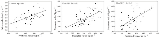 Using the methods obtained in Table 7, the NIR prediction models of four properties of the three clones were established with the full-cross validation method. As shown in Table 8, the Rc of the air dry density NIR calibration models were higher than those of other properties, and the effects of the prediction models differed little from those of the other properties. The prediction model of clone 108 was the best, with RP of 0.61 and RMSEP of 0.019. The correlation between the NIR predicted value and measured value of the air dry density of the three clones is shown in Figure 6. The results showed that NIR could achieve the prediction on the air dry density of the three poplar clones.