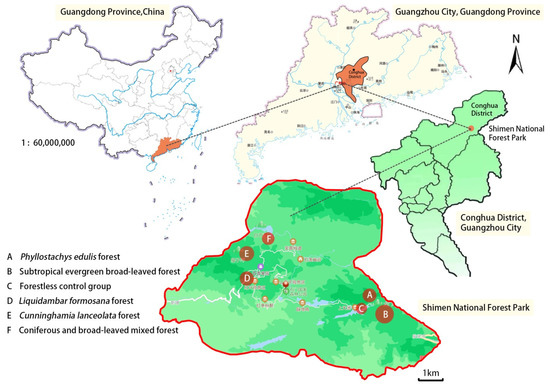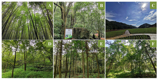 Sample plots of the Shimen National Forest Park. (A) Phyllostachys edulis forest; (B) Subtropical evergreen broad-leaved forest; (C) Forestless control group; (D) Liquidambar formosana forest; (E) Cunninghamia lanceolata forest; (F) Coniferous and broad-leaved mixed forest.
