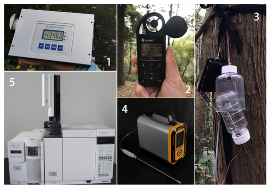 The experimental instruments. 1—COM-3200PRO II negative ion monitor (Guangzhou Extreme Technology Co., Ltd., Guangzhou, China); 2—Kestrel 5500 hand-held meteorological instrument (Beijing Kestrel Instrument & Meter Co. Ltd., Beijing, China); 3—Gas collecting equipment; 4—TD6000-SH-O2 oxygen content tester (Beijing Tiandi Shouhe Technology Development Co., Ltd., Beijing, China); 5—Agilent 7890B-5977B/GC-MS.