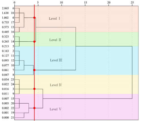 In SPSS20.0, Ward and Euclidean distance methods were used to analyze FCHI values systematically, and a tree diagram of Ward connections was obtained (Figure 4). Combined with literature research and practical needs, the red line was taken as a reference line and divided into five grades according to the value from high to low. The strength of the comprehensive healthcare benefits represented by different numerical intervals was explained; thus, a grading standard of comprehensive evaluation index of the forest environmental healthcare benefits was gained (Table 3).