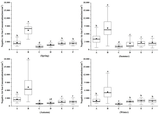 According to the analysis of variance, the negative air ion concentration in different forest types showed a strongly significant difference (p = 0.000 < 0.01) in different seasons (Figure 5). In spring, the order according to the negative air ion concentration mean value (±SD) was: subtropical evergreen broad-leaved forest (7394 ± 1811 ions/cm3) > Phyllostachys edulis forest (2644 ± 1044 ions/cm3) > Cunninghamia lanceolata forest (2461 ± 709 ions/cm3) > coniferous and broad-leaved mixed forest (2373 ± 562 ions/cm3) > Liquidambar formosana forest (1823 ± 650 ions/cm3) > forestless control group (1158 ± 430 ions/cm3). In summer, the order was: subtropical evergreen broad-leaved forest (8377 ± 3749 ions/cm3) > Phyllostachys edulis forest (4257 ± 2021 ions/cm3) > Cunninghamia lanceolata forest (2930 ± 1917 ions/cm3) > coniferous and broad-leaved mixed forest (2907 ± 2012 ions/cm3) > Liquidambar formosana forest (2529 ± 1996 ions/cm3) > forestless control group (1386 ± 556 ions/cm3). In autumn, the order was: subtropical evergreen broad-leaved forest (7234 ± 3465 ions/cm3) > Phyllostachys edulis forest (2589 ± 1028 ions/cm3) > Cunninghamia lanceolata forest (1671 ± 631 ions/cm3) > coniferous and broad-leaved mixed forest (1623 ± 643 ions/cm3) > Liquidambar formosana forest (1247 ± 693 ions/cm3) > forestless control group (941 ± 287 ions/cm3). In winter, the order was: subtropical evergreen broad-leaved forest (5409 ± 2567 ions/cm3) > Phyllostachys edulis forest (2131 ± 855 ions/cm3) > Cunninghamia lanceolata forest (2057 ± 620 ions/cm3) > coniferous and broad-leaved mixed forest (1943 ± 648 ions/cm3) > Liquidambar formosana forest (1726 ± 644 ions/cm3) > forestless control group (862 ± 413 ions/cm3).