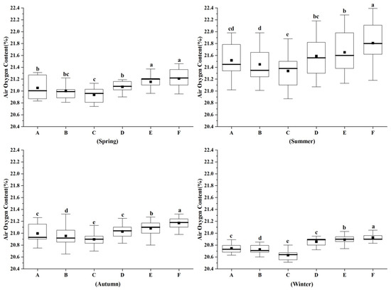 Comparison of air oxygen content in different forest types. A—Phyllostachys edulis forest; B—Subtropical evergreen broad-leaved forest; C—Forestless control group; D—Liquidambar formosana forest; E—Cunninghamia lanceolata forest; F—Coniferous and broad-leaved mixed forest. The different lowercase letters indicate significant difference among the stand types in the same time (p < 0.05).