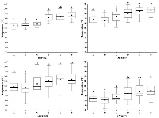The temperature changes of different forest types in different seasons. A—Phyllostachys edulis forest; B—Subtropical evergreen broad-leaved forest; C—Forestless control group; D—Liquidambar formosana forest; E—Cunninghamia lanceolata forest; F—Coniferous and broad-leaved mixed forest. The different lowercase letters indicate significant difference among the stand types in the same time (p < 0.05).