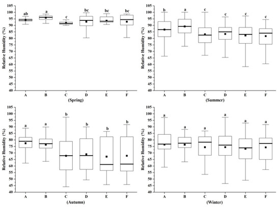 The relative humidity changes of different forest types in different seasons. A—Phyllostachys edulis forest; B—Subtropical evergreen broad-leaved forest; C—Forestless control group; D—Liquidambar formosana forest; E—Cunninghamia lanceolata forest; F—Coniferous and broad-leaved mixed forest. The different lowercase letters indicate significant difference among the stand types in the same time (p < 0.05).