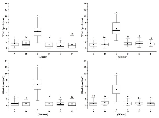The wind speed changes of different forest types in different seasons. A—Phyllostachys edulis forest; B—Subtropical evergreen broad-leaved forest; C—Forestless control group; D—Liquidambar formosana forest; E—Cunninghamia lanceolata forest; F—Coniferous and broad-leaved mixed forest. The different lowercase letters indicate significant difference among the stand types in the same time (p < 0.05).