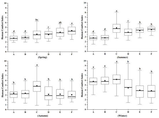 Comparison of the human comfort index in different forest types. A—Phyllostachys edulis forest; B—Subtropical evergreen broad-leaved forest; C—Forestless control group; D—Liquidambar formosana forest; E—Cunninghamia lanceolata forest; F—Coniferous and broad-leaved mixed forest. The different lowercase letters indicate significant difference among the stand types in the same time (p < 0.05).