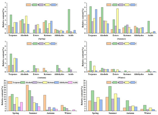 According to variance analysis, the mean value of relative content of phytoncide in different forest types illuminated extremely significant differences (p = 0.000 < 0.01) in different seasons (Figure 11). In spring, the order was: subtropical evergreen broad-leaved forest (17.44%) > Cunninghamia lanceolata forest (11.67%) > coniferous and broad-leaved mixed forest (9.61%) > Phyllostachys edulis forest (8.66%) > Liquidambar formosana forest (7.44%) > forestless control group (0.00%). In summer, the order was: subtropical evergreen broad-leaved forest (21.11%) > Cunninghamia lanceolata forest (14.75%) > Phyllostachys edulis forest (11.88%) > coniferous and broad-leaved mixed forest (11.23%) > Liquidambar formosana forest (10.27%) > forestless control group (0.00%). In autumn, the order was: subtropical monsoon evergreen broad-leaved forest (8.91%) > Cunninghamia lanceolata forest (4.35%) > Liquidambar formosana forest (3.67%) > coniferous and broad-leaved mixed forest (3.48%) > Phyllostachys edulis forest (2.59%) > forestless control group (0.00%). In winter, the order was: subtropical evergreen broad-leaved forest (4.85%) > Cunninghamia lanceolata forest (2.61%) > Phyllostachys edulis forest (1.44%) > coniferous and broad-leaved mixed forest (1.24%) > Liquidambar formosana forest (1.16%) > forestless control group (0.00%). In addition, there are wide differences in phytoncide substances emitted from forests in different seasons. Mainly alcohols, terpenes, ketones and acids in spring. Terpenes, alcohols and esters were primary volatilized in summer. Terpenes were the dominating species in autumn, and very little phytoncide substances were discharged in winter, among, which terpenes account for the highest proportion.