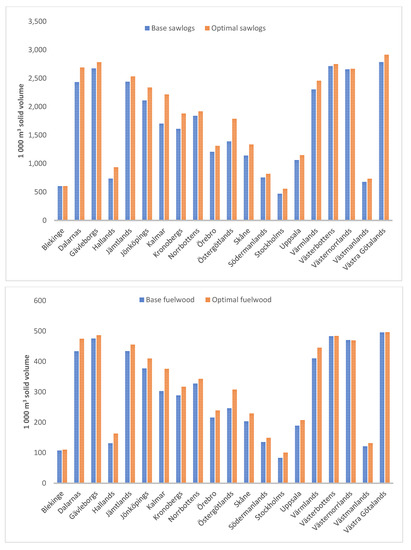 Results are also available on county level. Figure 2 presents the observed (base value) and efficient (optimal value) harvesting levels for the four wood assortments by county (average over the time-period) (the complete data for the results is presented in the Appendix A). For sawlogs, the largest (lowest) percentage increase in harvesting is achievable in the county of Kalmar (Blekinge) where the sawlog harvest can increase by more than 30 percent (0.2 percent) if the most efficient practice is used. In addition to Blekinge, the counties of Västernorrland and Västerbotten also show small increase potentials (i.e., the harvesting level of sawlogs are already close to the efficient level). For pulpwood, the corresponding largest (lowest) increase can be achieved in the county of Östergötland (Blekinge) where the pulpwood harvest can increase by approximately 24.5 percent (0.7 percent). The counties of Västra Götaland, Västernorrland and Västerbotten also have low increase potentials. Östergötland is also the county that can increase their harvest of fuelwood the most, by almost 25 percent. On the other hand, the results indicate that the county of Västernorrland need to reduce their harvest of fuelwood by 0.3 percent to become efficient. Thus, the fuelwood resources are currently slightly overexploited in Västernorrland. However, this result is well within the margin of error. The counties of Västra Götaland and Västerbotten also have a harvesting level of fuelwood that is close to the efficient level. Finally, the extraction of harvesting residues can increase by 17 percent in the county of Dalarna while the results suggest that the extraction level in Jämtland county is already efficient. However, harvesting residues is the product that has the potential to have the highest increase in most counties.
