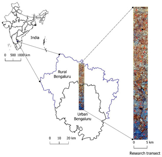 In the framework of a larger Indian-German collaborative research project (FOR2432/2), a 5 km × 50 km research transect was defined in the northern part of Bengaluru (Figure 1). This transect contains different land-use categories; it extends over rural, transition and urban areas and is representative for the urban–rural gradient of the emerged megacity Bengaluru.