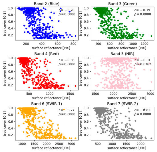 Scatterplot of band-wise Landsat surface reflectance values (scale factor 0.001) against tree cover per pixel, where 0 equals 0% and 1 equals 100%.
