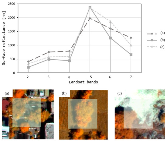 Figure 3 illustrates the variation in the spectral response for a single Landsat pixel. Upon comparing the high-resolution WorldView-3 subsets (Figure 3a–c), we found that what all three examples had in common is that the percentage tree cover for the overlaid 30 m × 30 m Landsat pixel was within a range of 40–50%, in contrast with the surrounding landscape, which can cover impervious surfaces, agricultural land, barren land, etc. The resulting mixed pixels were strongly influenced by the varying land-cover conditions and led to different spectral signatures (Figure 3), which still had a similar percentage tree cover, a challenging situation for the classifier.
