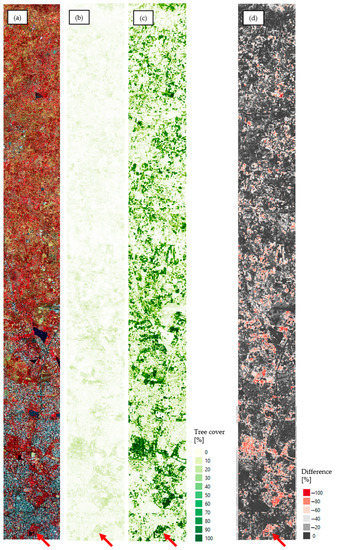 (a) WorldView-3 false color composite (near infrared-red-green) from a subset of the study area. (b) Percent tree cover per pixel from the Global 30 m Landsat Tree Canopy Version 4 [13]. (c) Percent tree cover per pixel from Landsat-8 in our study. Legend is the same for (b,c). (d) Difference map: “global tree cover” (b) minus “our predicted product” (c).