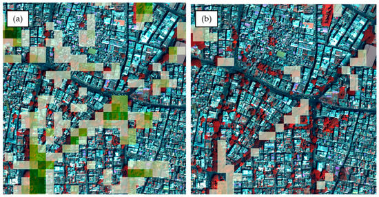 600 m × 600 m subset of the WorldView-3 image from the urban parts of our study area, with alleys and solitary trees of varying crown size overlaid with (a) our predicted Landsat tree cover per pixel and (b) the Global 30 m Landsat Tree Canopy Version 4. The bright green pixels in (b) show a very low canopy cover, which obviously should be much higher when looking at the WorldView-3 image. Our prediction (a) shows a more reasonable canopy cover.