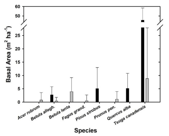 Prior to the disturbance, the sampled area supported a basal area of 58.50 m2/ha of trees (>10 cm DBH), the majority of which was T. canadensis (45.50 m2/ha), with smaller amounts of P. strobus (5.09 m2/ha), Quercus alba (5.11 m2/ha), and other species (Figure 1).
