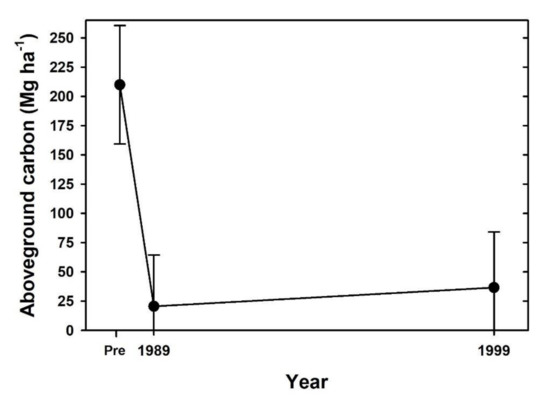 Aboveground live tree carbon from pre-disturbance, immediately after disturbance, and ten years after disturbance. Error bars are one standard deviation; pre-disturbance sampling from six 20 m × 20 m plots; 1989 and 1999 sampling from 55, 12.57 m2 plots.