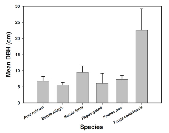 Combining the post-disturbance recruits with the advanced regeneration that survived the disturbance, gives an overall picture of the 1999 vegetation. Ten years after the disturbance, the total basal area of surviving trees, released understory stems, sprouts, and new seedlings was 16.71 m2 ha−1 or 28.5% of the pre-disturbance basal area. T. canadensis was the dominant species in 1999, with twice the basal area (8.8 m2 ha−1) of the second most dominant species, B. lenta (3.9 m2 ha−1), as well as the greatest mean dbh among species (Figure 3). Other major species were P. pensylvanica (1.1 m2 ha−1), A. rubrum (0.8 m2 ha−1), and B. alleghaniensis (0.5 m2 ha−1). The P. strobus and Q. alba that were important in the pre-disturbance canopy were virtually absent.