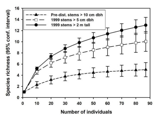 Species diversity was explored via rarefaction curves. Based on the 87 stems of pre-disturbance canopy trees in the six large plots, three rarefaction curves were constructed from (a) the pre-disturbance canopy trees (all 87 stems); (b) the 1999 survivors and regeneration stems > 5 cm dbh; and (c) the 1999 survivors and regeneration stems > 2 m tall. In the latter two cases, the rarefaction curves were calculated up to 87 stems, for comparison with the pre-disturbance trees. Rarefaction was accomplished with the iNextOnline software (chao.shinyapps.io/iNextOnline/, accessed on 11 January 2021), set to generate 95% confidence limits.