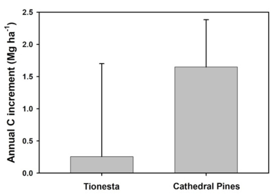 Aboveground live-tree carbon increased from 20.7 ± 43.9 Mg ha−1 in 1989 to 37.1 Mg ha−1 in 1999 or 17.7% of the pre-disturbance levels. This amounted to a mean accumulation rate of 1.6 ± 0.7 Mg ha−1. This annual rate across 10 years was compared to the annual accumulation rate across six years at the Tionesta site [17]; non-normality of data and disparate sample sizes required a non-parametric Mann-Whitney rank sum test (Figure 5). The rate at Cathedral Pines (median = 1.6 Mg ha−1) was significantly greater than the rate at Tionesta (median = 0.3 Mg ha−1; U = 5288, T = 12,147, nsmall = 55, nbig = 289, p < 0.001).