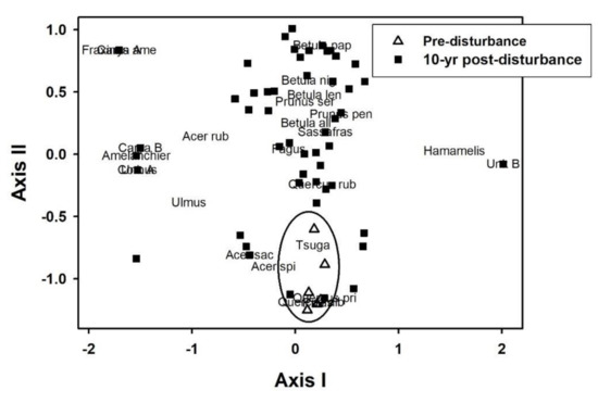 The majority of dominant stems ten years after the disturbance was derived from previously-suppressed T. canadensis saplings that were 1–10 cm dbh at the time of disturbance; this is consistent with trends observed in several other post-windthrow revegetation studies e.g., [14,19]. Closed-canopy T. canadensis stands, such as existed prior to the disturbance at Cathedral Pines, are very heavily shaded, which likely explains the paucity of species other than T. canadensis in the advanced regeneration [43,44]. Given the substantial size advantage of the T. canadensis at the time of disturbance, along with the potential long life of this species, this species might be expected to be canopy dominant for many decades or a century or more. In this scenario, the recovering forest in the first several decades would be a mix of released advanced regeneration (with T. canadensis dominant), with subordinate seedling recruits of several hardwood species. However, it is likely that T. canadensis will experience high mortality from the hemlock woolly adelgid, suggesting that the more likely species composition scenario is that T. canadensis will steadily decline in dominance over several decades, leaving B. lenta to inherit the dominant role, with A. rubrum and P. serotina as subordinates, and several other tree species contributing to elevated (compared to pre-storm) species diversity over the next century. The result is likely to be very little compositional change initially, which then steadily increases until the pre-disturbance dominant species is eliminated. Thus, the wave of post-disturbance new seedling establishment will likely eventually result in a more diverse forest, albeit one that initially passes through a low-diversity phase of dominance by T. canadensis. Figure 7 shows the compositional variation among the 1999 survey plots, as well as their distinctiveness from the pre-disturbance canopy trees; this figure thus hints at the more variable composition in the smaller seedling layers that will emerge after mortality of the initially dominant T. canadensis. The future more-diverse stand may even be less vulnerable to wind disturbance due to the absence of P. strobus and T. canadensis. Hypothesis 1 would therefore appear to be confirmed initially, but in later decades the increase in diversity and change in composition would suggest that Hypothesis 1 is no longer supported.