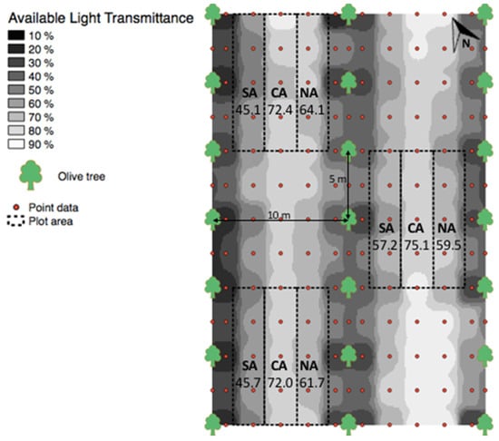 In order to assess the effect of light reduction on alfalfa biomass production, the shade levels under the olive tree canopy were calculated for each plot of ACS as reported in the following equation: