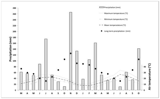 March 2014–October 2015 and long-term 1971–2000 monthly rainfall, minimum, mean and maximum monthly air temperature in Manciano (Grosseto, Italy). The graph is presented according to Bagnouls and Gaussen [42], in order to identify the occurrence of dry condition, i.e., when rainfall is equal to or lower than twice the monthly mean air temperature.